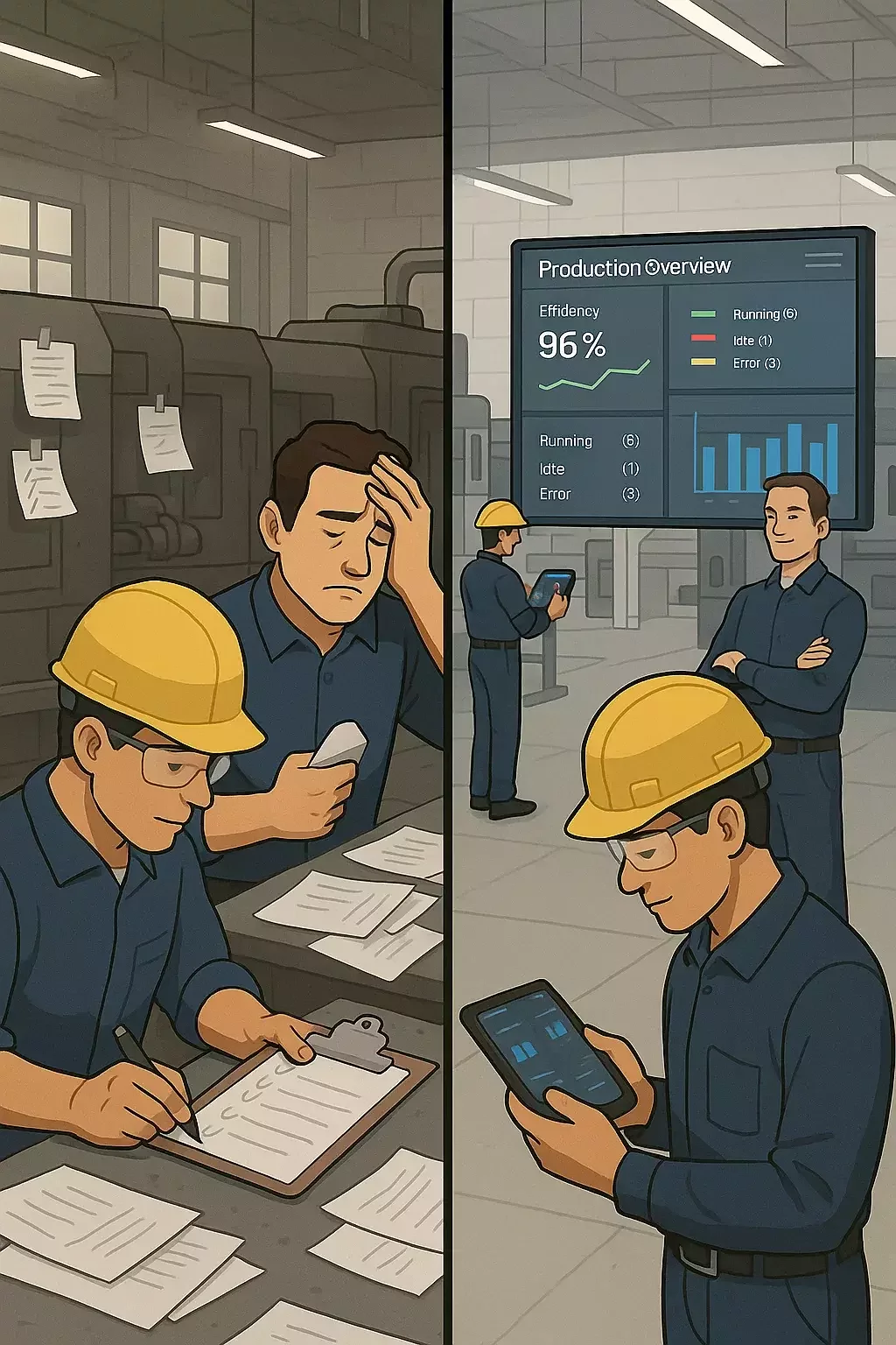 Problem: Lack of visibility. You don’t know which machine is running, idle, or down at this exact moment. You only find out end-of-shift or worse, end-of-month.